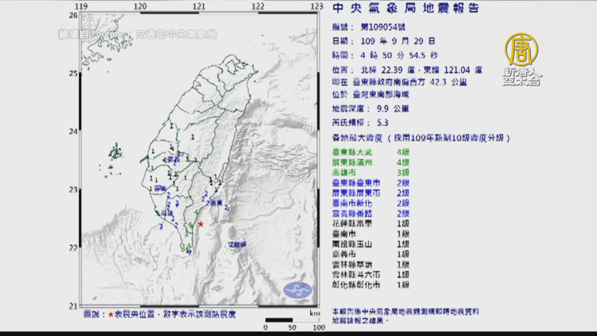【新唐人亞太台 2020 年 09 月 29 日訊】早安新唐人,先來看到,今晨地牛翻身,氣象局表示,今天(29日)清晨3點5分發生芮氏規模4.4地震,地震深度10.9公里,震央位於台東縣政府南偏西方42.7公里,最大震度台東縣4級。