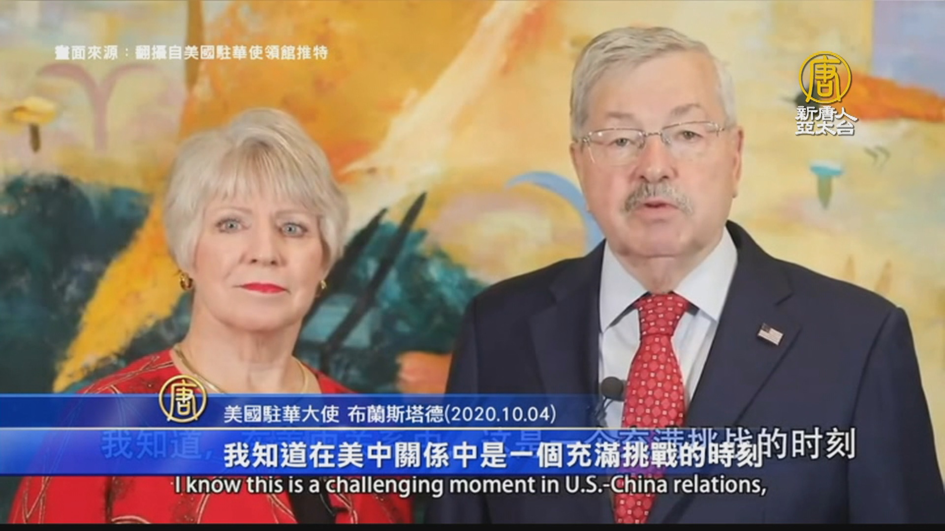 【新唐人亞太台 2020 年 10 月 05 日訊】帶您關心,美國駐華大使布蘭斯塔德昨天(10/4)離任返回美國,他與夫人錄了一段臨別影片,布蘭斯塔德表示,美中關係處於充滿挑戰的時刻,不過強調,對中國人民與文化的讚譽未曾改變。