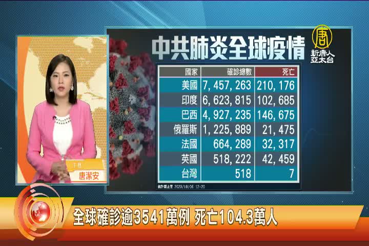 【新唐人亞太台 2020 年 10 月 06 日訊】午報頭條先來關心,中共肺炎動態,目前全球公開數據,累計確診超過 3千5百41萬人,其中超過 104萬人死亡。美國累計確診超過 745萬例,死亡 21萬人,紐約州疫情嚴重地區宣布停課。印度累計確診超過662萬例。俄羅斯新增1萬8百多例,創5月12日以來新高。法國巴黎及近郊三省疫情反彈嚴重,當局宣布進入最高警戒狀態。而在台灣,今天新增3例境外移入,累計確診 521例。另外,中共、伊朗等國家,被認為嚴重低報數據。