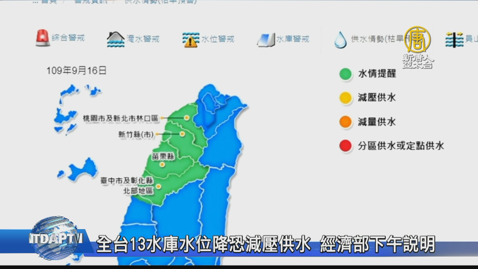 【新唐人亞太台 2020 年 10 月 07 日訊】台灣水情吃緊,因為今年沒有颱風,加上連日降雨少,導致全台13個水庫水位下降,其中翡翠水庫、石門水庫、曾文水庫,三大水庫蓄水量更跌破5成,全台水庫存量創17年同期以來最低,經濟部長王美花上午表示,經濟部首度召開旱災應變會議,會不會下修水情燈號、實施夜間減壓供水,將在下午對外說明。