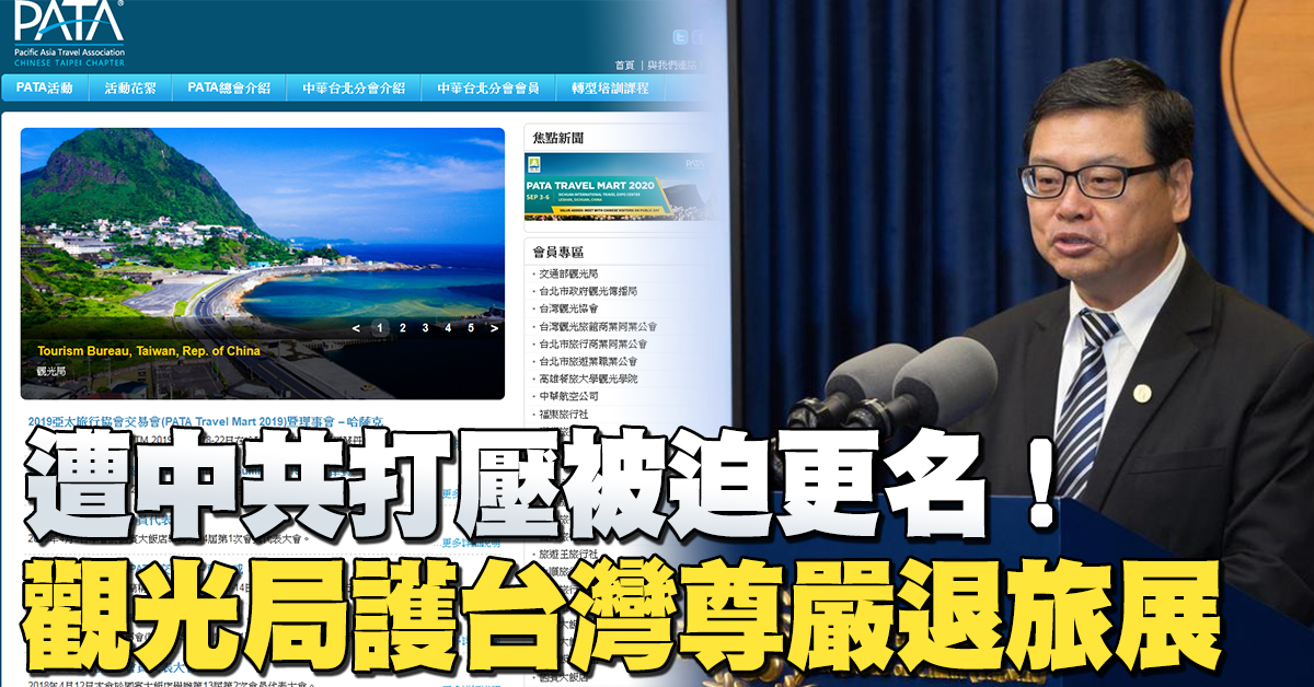 【新唐人亞太台 2020 年 10 月 08 日訊】好,國際挺台呼聲越來越高,但中共仍公開打壓台灣;台灣觀光局證實,中共逼迫更名,讓台灣被迫退出一年一度的國際旅展。台灣身為亞太旅行協會(PATA)的創辦國之一,原定報名參加今年9月的線上旅展,不過卻遭今年主辦的中國,先是無預警改名為「台灣海峽觀光協會」,後來又將台灣的參展網頁移除,還告知說要經過事前審查才能參與活動,對此,交通部觀光局長親自寫信向PATA抗議,怒批中共「蠻橫粗暴」,表示作為台灣觀光的官方機構,並捍衛台灣尊嚴,宣布退出今年的旅展。