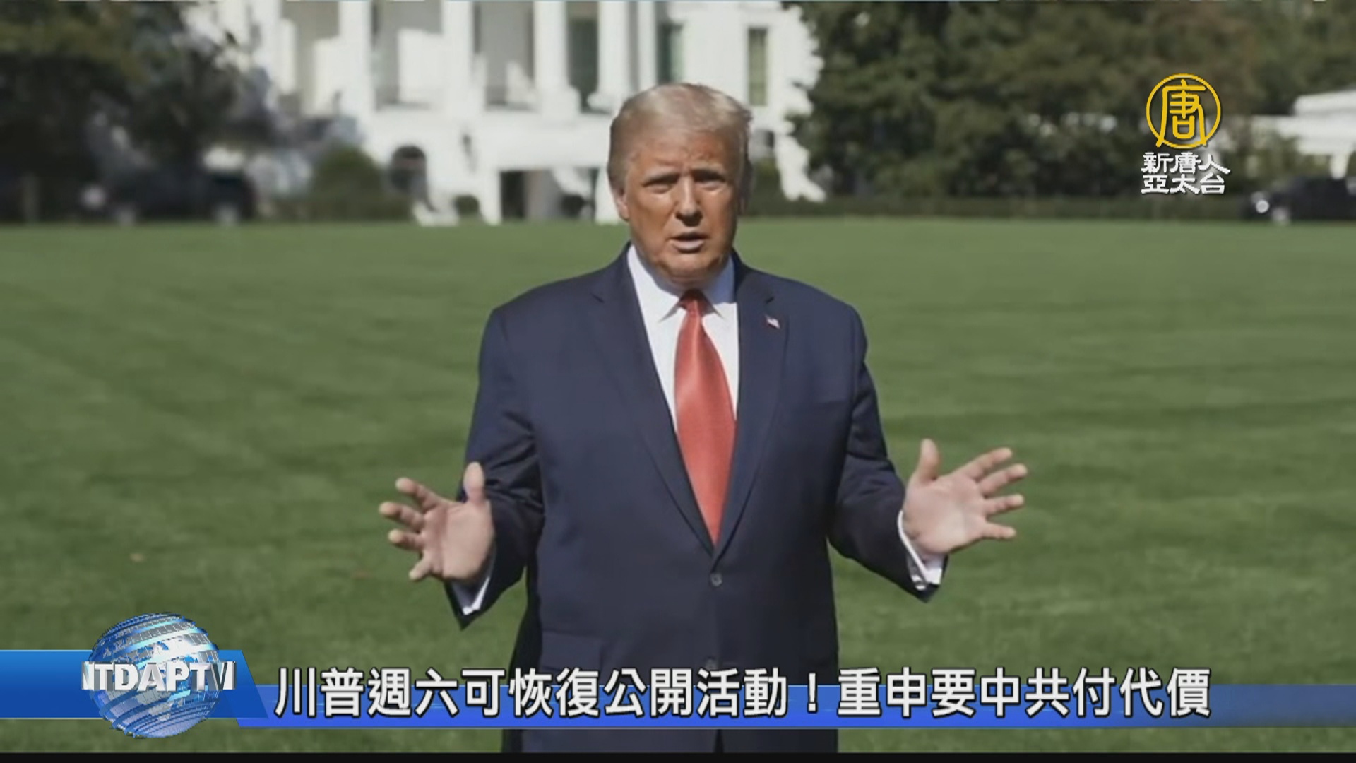 【新唐人亞太台 2020 年 10 月 09 日訊】再來關心,美國總統川普Covid-19檢驗陽性以來已經經過10天。白宮醫師康利表示,川普的身體狀況穩定,預計這個週六川普就能出席公開活動。川普在最新發布的影片中表示,中共將對疫情付出巨大的代價。