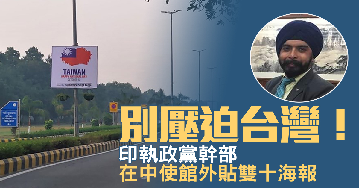 印度獨立記者考爾(Aditya Raj Kaul)深夜Twitter上傳影片,中共駐印度大使館外的街道,被掛滿祝賀台灣雙十國慶日的海報,而海報上的領土範圍,還涵蓋整個中國大陸,海報上署名,是由執政的印度人民黨發言人巴加(Tajinder Bagga)所張貼。