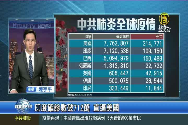 【新唐人亞太台 2020 年 10 月 12 日訊】來關心肺炎疫情最新情況,全球累計確診超過3千7百48萬人,1百07萬6千多人死亡。但中共、伊朗等國家,被認為嚴重低報數據。美國確診超過7百76萬2千多例、死亡21萬4千多人。印度新增6萬6千多例確診,總計突破712萬例,直逼美國的確診數。巴西新增1萬2千多例。俄羅斯確診新增1萬3千多例。英國也新增1萬2千多例確診,英格蘭北部是新一波疫情的重災區,首相強生將宣布實施新的防疫措施。伊朗原子能組織首長沙列西確診,成為最新一位染疫的伊朗高官。