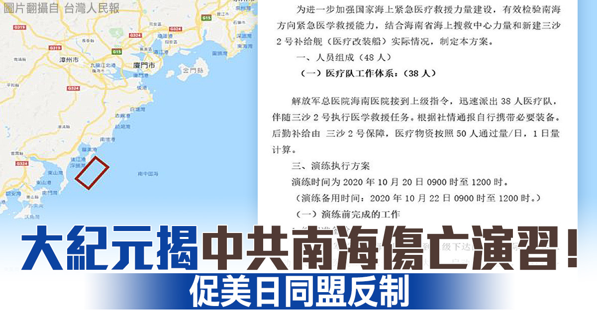 【新唐人亞太台 2020 年 10 月 12 日訊】雙十國慶前夕,中共又派出「運8」反潛機擾台。蔡英文總統向北京喊話之後,中共又宣布明天開始在福建海域進行實彈射擊。大紀元時報獨家取得中共內部文件,指出,共軍這個月將在南海進行傷亡演習。面對中共不斷上升的軍事威脅,美日軍方在南海舉行兩棲登陸聯合軍演,而日本的「準航母」加賀號也現身南海,威懾中共的海上活動。