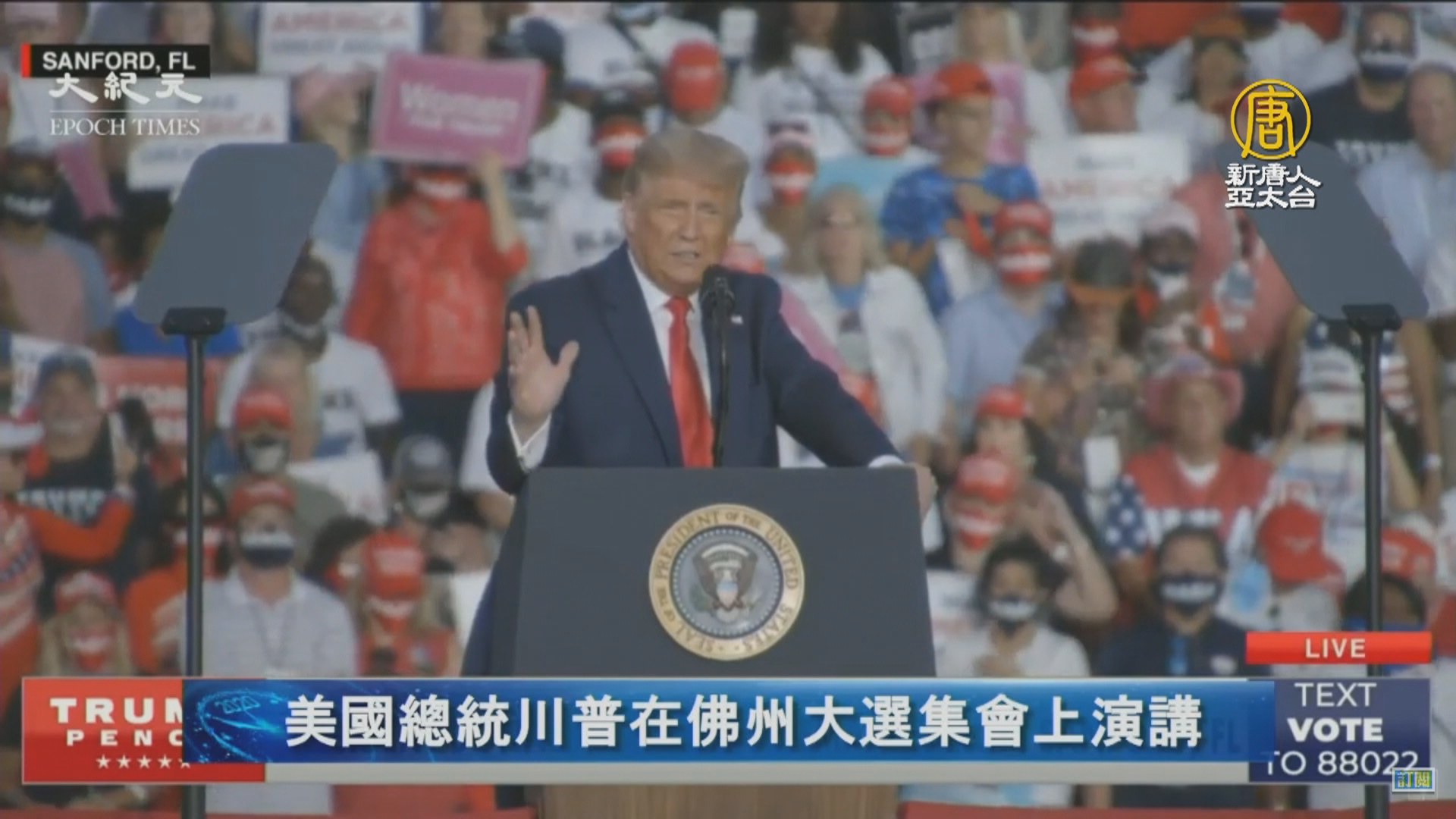 【新唐人亞太台 2020 年 10 月 13 日訊】美國總統川普,在台北時間早上七點,也就是現在,正出席佛羅里達州的大型競選集會,來看我們目前正在直播口譯的最新畫面。