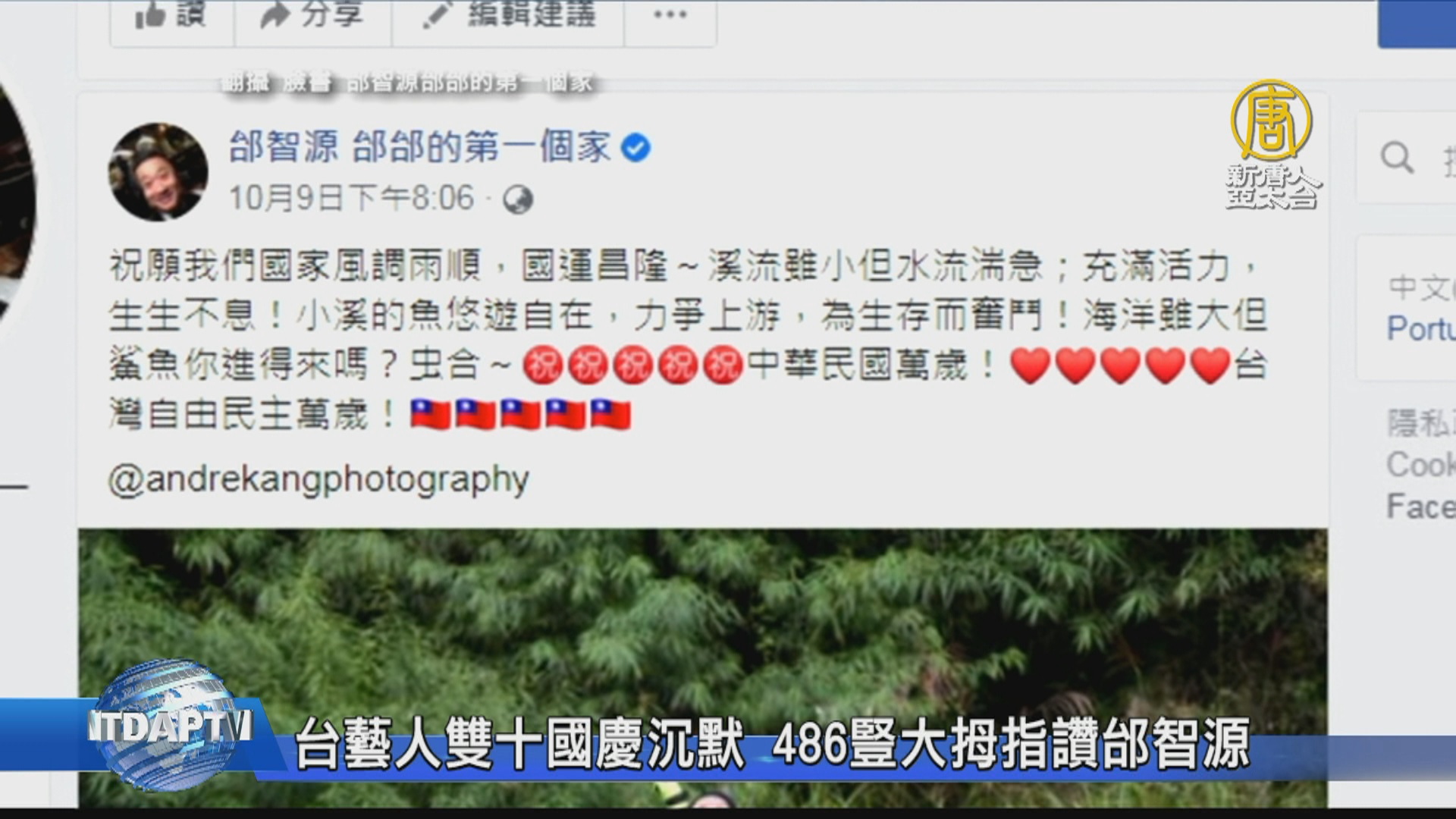 【新唐人亞太台 2020 年 10 月 13 日訊】前幾天是中華民國國慶日,多數台灣藝人選擇噤聲,不過藝人邰智源,則在臉書上大方祝賀雙十國慶,底下網友一片讚聲,電商網紅486先生,今天(13日)出席活動時,也豎起大拇指,大讚邰智源有骨氣。