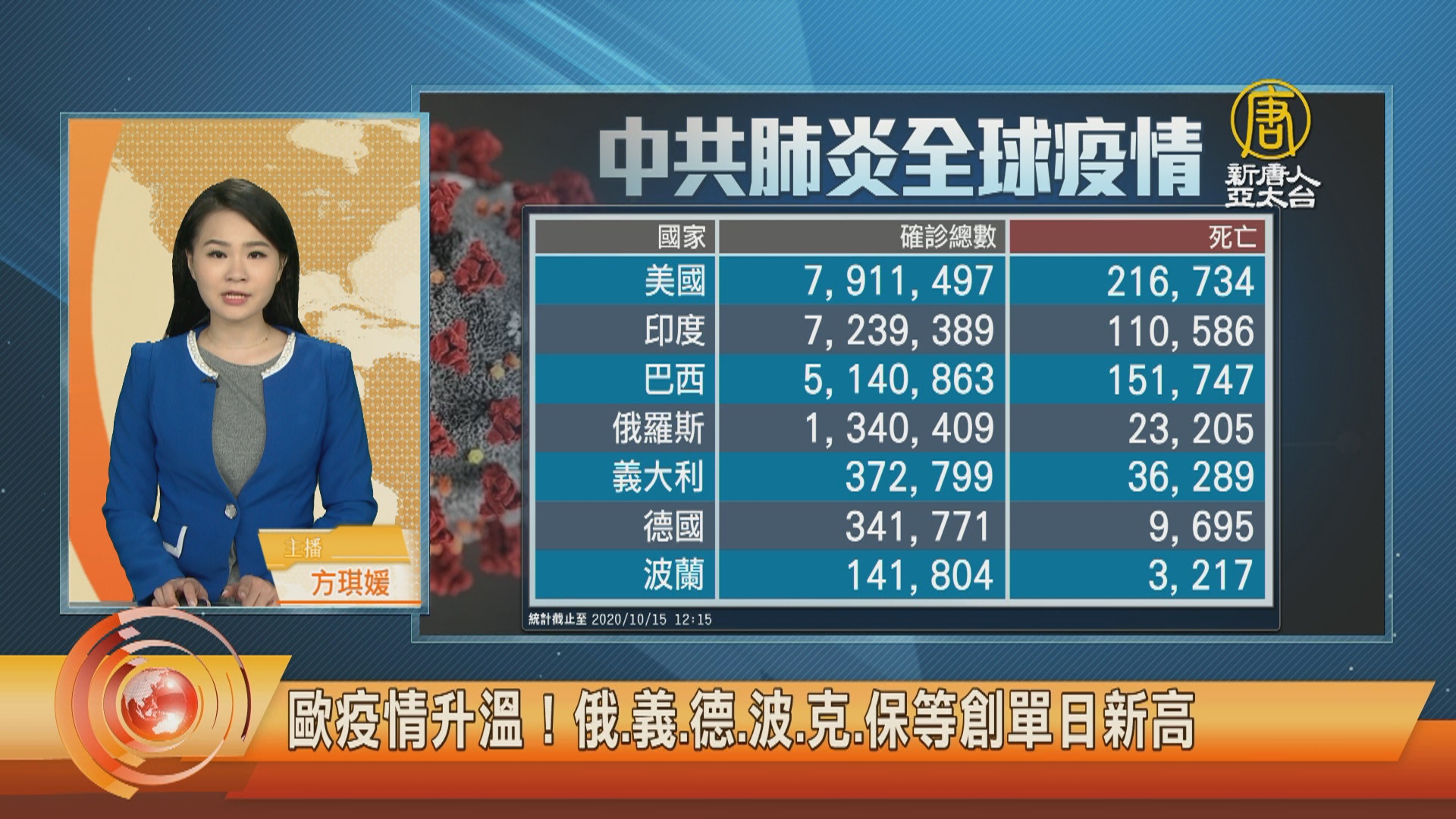 【新唐人亞太台 2020 年 10 月 15 日訊】來關心中共肺炎動態,目前全球公開數據,累計確診超過 3千8百42萬人,其中109萬人死亡。美國累計確診791萬例,死亡 21萬6千多人。印度持續惡化,再添 6.3萬人確診,直追美國;歐洲疫情再度升溫,俄羅斯、義大利、德國、波蘭、克羅埃西亞,及保加利亞等國,單日新增確診數都創下新高。法國出現第二波疫情反撲,大巴黎地區以及8個大城市,17日開始實施宵禁,預計維持4到6週。而一直被認為嚴重低報數據的伊朗,單日新增 279人死亡,也創下伊朗新高。