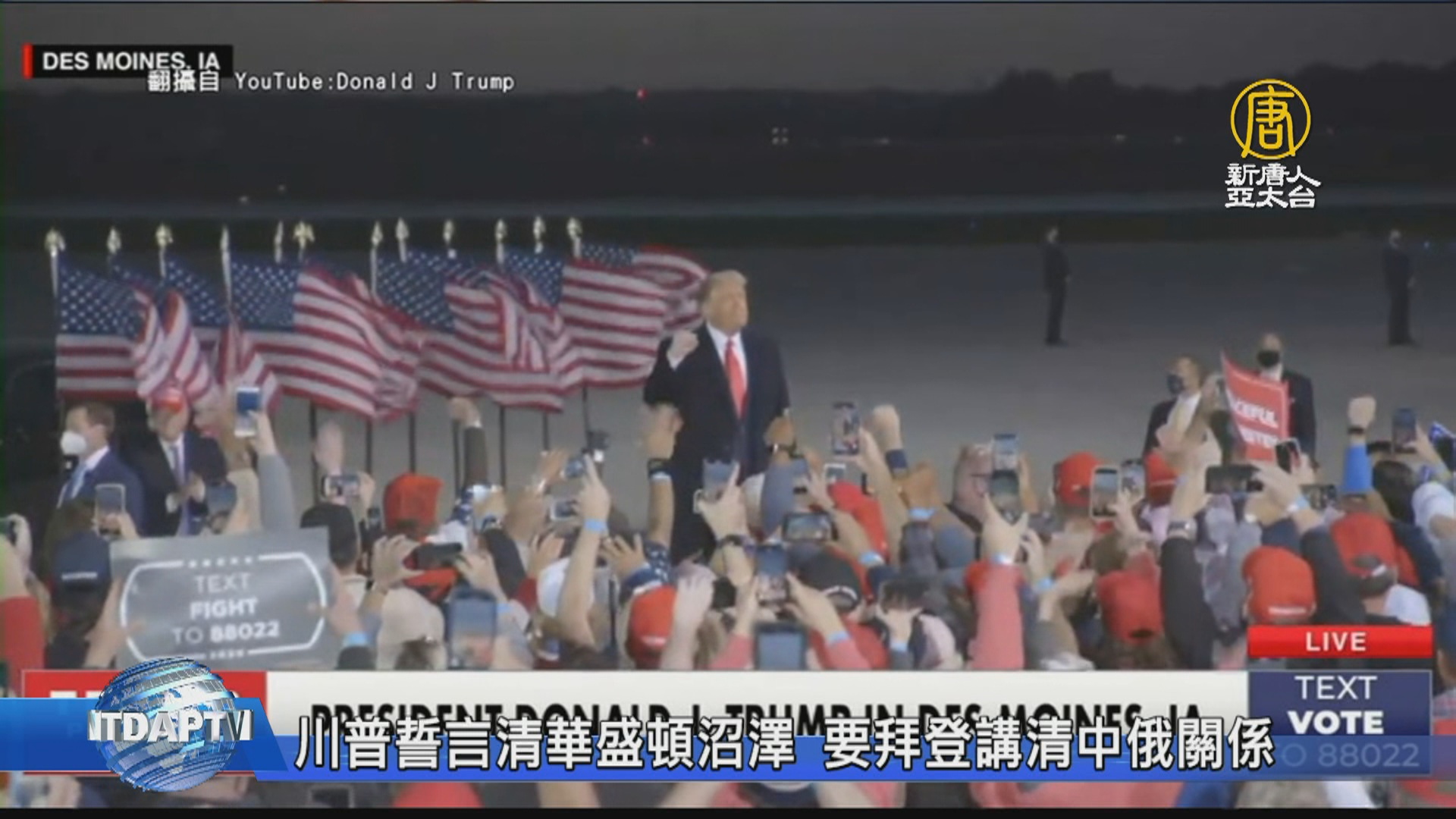 【新唐人亞太台 2020 年 10 月 15 日訊】美國總統川普週三出席愛荷華州的造勢活動,他再次提到要抽乾華盛頓沼澤,並表示拜登欠人民一個道歉,要拜登公開與中俄的關係。