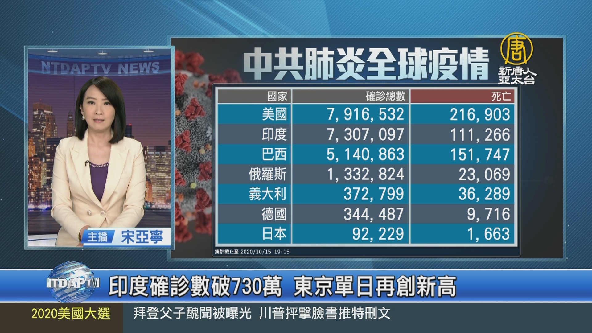 【新唐人亞太台 2020 年 10 月 15 日訊】來關心肺炎疫情最新情況,目前全球公開數據,累計確診超過 3千8百55萬人,其中109萬人死亡。美國累計確診791萬6千多例,死亡超過21萬6千人。印度持續惡化,再添6萬7千人確診,總計突破7百30萬,直追美國;歐洲疫情再度升溫,俄羅斯、義大利、英國、德國、波蘭、克羅埃西亞,及保加利亞等國,單日新增確診數都創下新高。而一直被認為嚴重低報數據的伊朗,單日新增 279人死亡,也創下新高紀錄,是疫情最嚴重的中東國家。日本大學的運動社團爆發62人群聚感染,東京新增284名確診,是約兩個月以來的單日新高紀錄。
