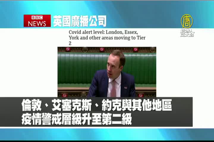 【新唐人亞太台 2020 年 10 月 16 日訊】繼續是英國廣播公司BBC的報導:英國倫敦、艾塞克斯、約克與其他地區疫情警戒層級升至第二級。