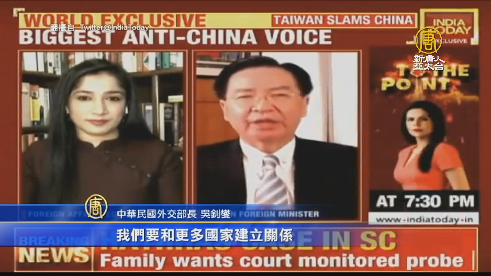 【新唐人亞太台 2020 年 10 月 16 日訊】最新消息,印度媒體《今日印度》專訪台灣外交部長吳釗燮,15日晚間播出專訪報導,吳釗燮強調,中共從來就沒有一天統治過台灣,他也談到台印度供應鏈合作,並說樂見美日印澳四國共同因應印太區域的挑戰所作的努力,並說明台灣有高度意願與理念相近國家共同維護自由。