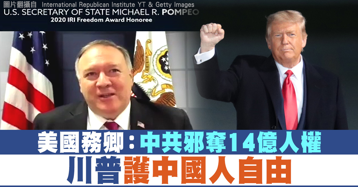 美國國務卿蓬佩奧(Mike Pompeo),13日獲頒國際共和學會(IRI)的自由獎項。在視訊演說表示,邪惡沒有消失,正在壓迫香港、與中共防火牆後每個地方的人,中共剝奪了14億中國人民的基本人權。