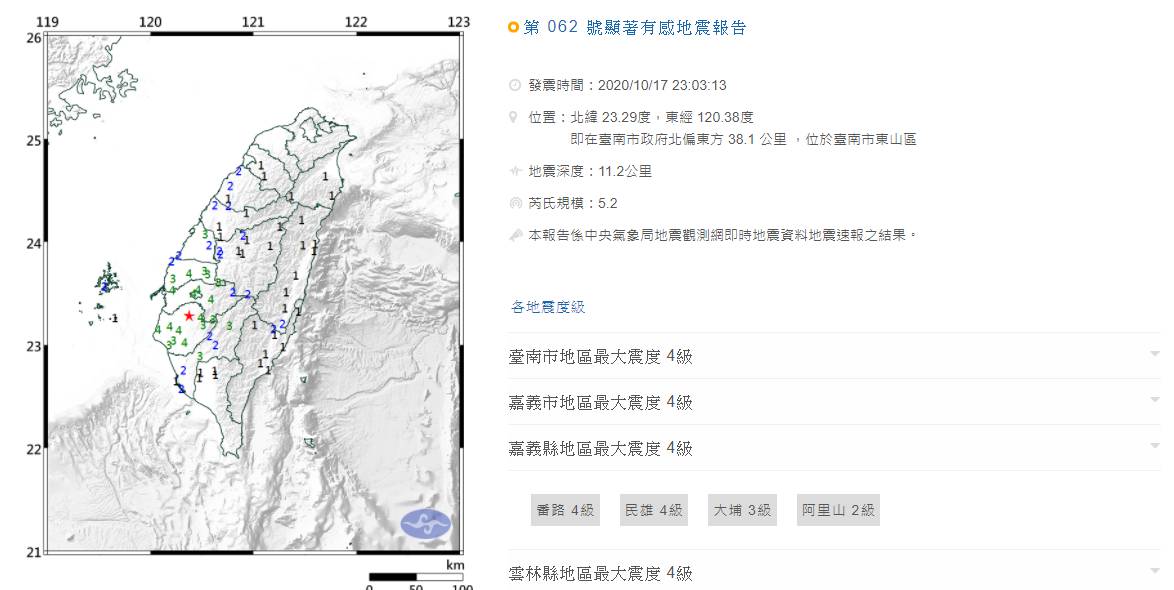 【新唐人亞太台 2020 年 10 月 17 日訊】根據中央氣象局最新資訊,17日晚間11時3分及11時5分連續發生芮氏規模5.2有感地震,地震深度11.2公里,震央位於台南市政府北偏東方38.1公里(位於台南市東山區),最大震度台南市4級,嘉義縣4級、雲林縣4級,高雄市、彰化縣3級。
