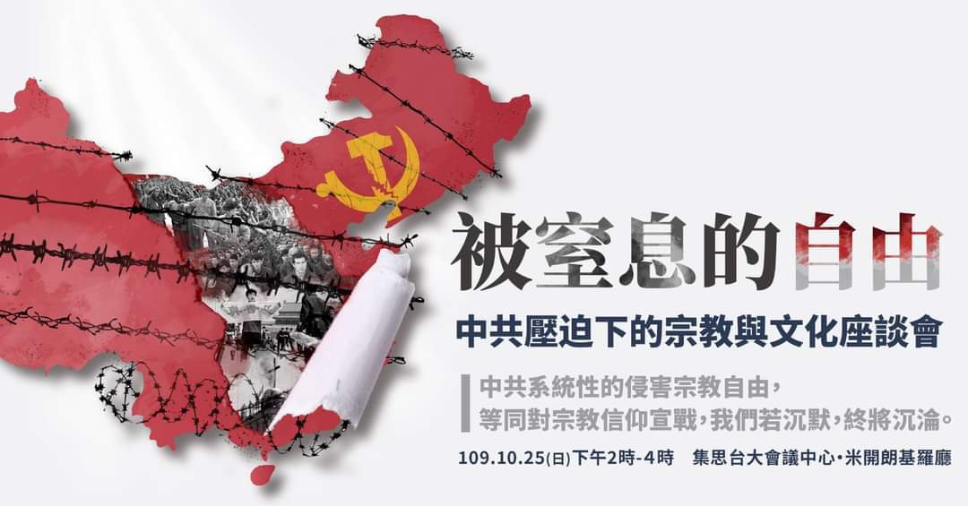 【新唐人亞太台 2020 年 10 月 18 日訊】「被窒息的自由-中共壓迫下的宗教與文化座談會」10月25日將在台北登場;解析中共系統性迫害各宗教信仰及滅絕群體與文化的現況、侵害信仰與文化的手法、世界的覺醒與圍堵、建言台灣的因應之道。
