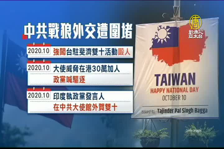 【新唐人亞太台 2020 年 10 月 19 日訊】盤點中共戰狼外交,近來遭國際圍堵的情況,光是今年10月份,就包括,強闖台灣駐斐濟雙十活動毆人;而中共大使威脅在港30萬加人,加拿大政黨喊要驅逐。另外,最受外界熱議的是,中共大使館威脅印度媒體的雙十節報導,反來引來輿論反攻,印度執政黨發言人還在中共大使館外,貼上慶賀雙十的海報。另外,今年八月份,中共外長王毅公然威脅訪台的捷克議長,歐洲領袖力挺韋德齊。5月份,中共大使館要求巴西國會對總統蔡英文就職一事「保持沈默」,事件遭巴西眾議員曝光後,引起巴西網友眾怒,「台灣萬歲」登熱搜。而去年,中共外交官強闖美軍基地,直接遭美方驅逐。