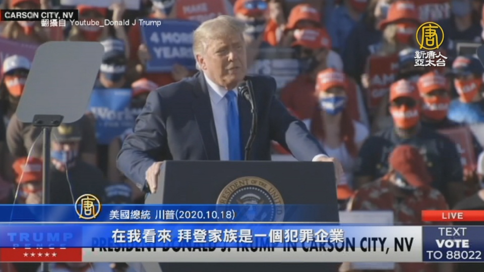 【新唐人亞太台 2020 年 10 月 19 日訊】美國總統大選倒數,美國總統川普週末兩天跑了三個州舉行造勢活動。民主黨拜登則選擇待在家,沒有公開行程。今早,川普演講時批評,拜登家族是犯罪企業。