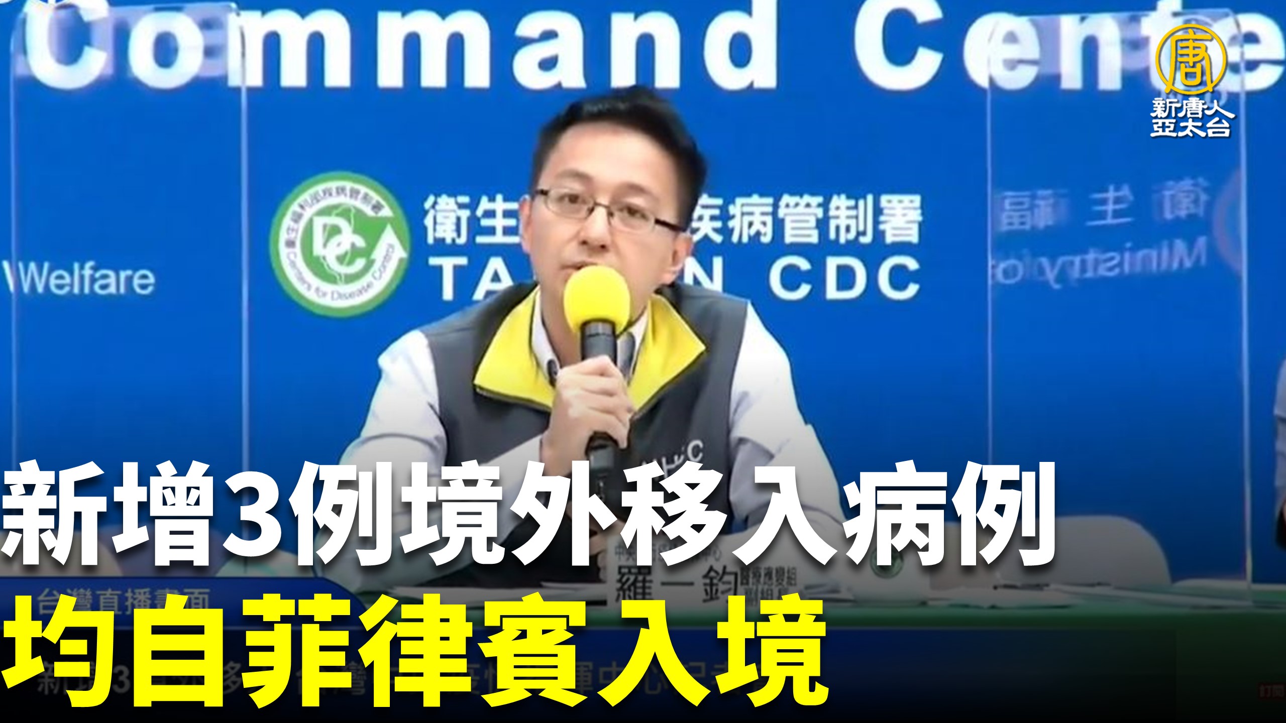 【新唐人亞太台 2020 年 10 月 20 日訊】今(20)日中央流行疫情指揮中心公布,國內新增3例境外移入中共病毒病例,分別為菲律賓籍20多歲女性(案541)、菲律賓籍20多歲男性(案542)及本國籍50多歲男性(案543),均自菲律賓入境。