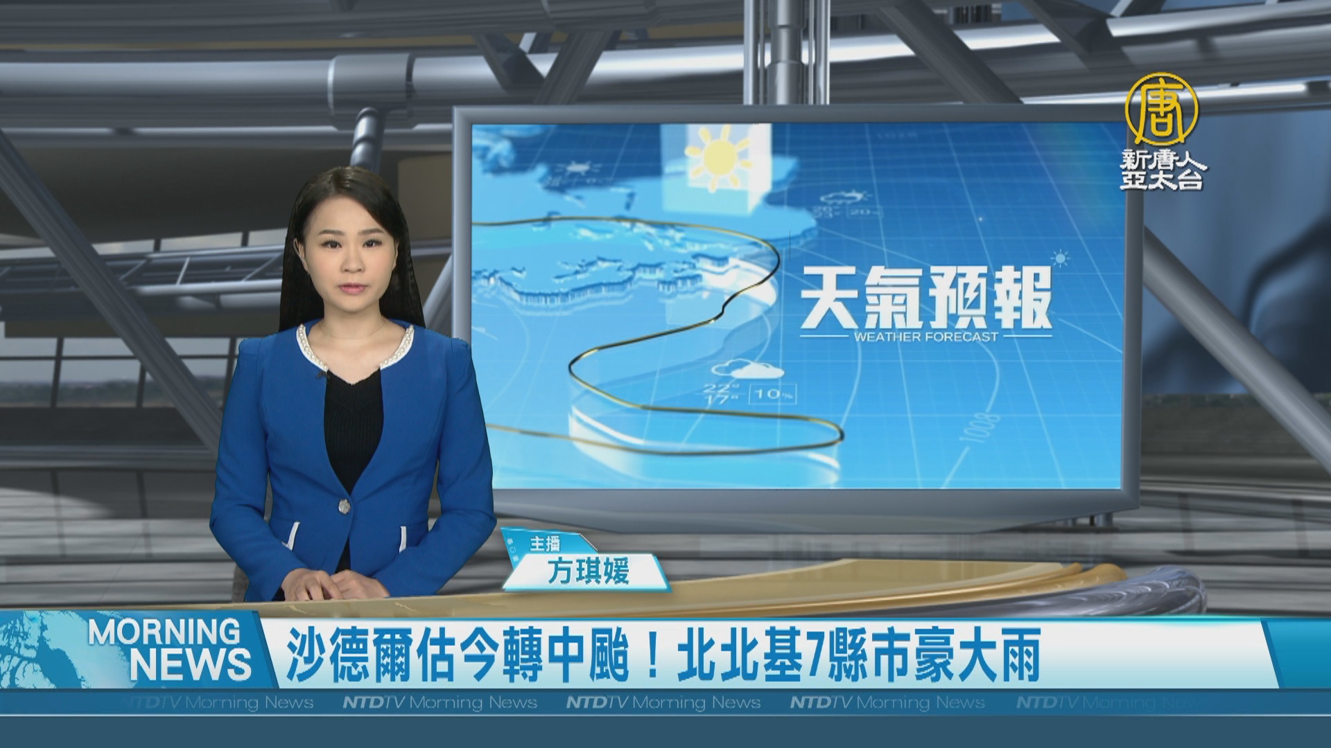 【新唐人亞太台 2020 年 10 月 22 日訊】歡迎您收看10月22日的早安新唐人,我是方琪媛,先來帶您關心今天的天氣情況。輕度颱風沙德爾今天下半天有可能增強成中度颱風,氣象局今晨持續對7縣市發布「豪大雨特報」,受到東北風及颱風外圍環流影響,宜蘭縣已有豪雨發生,提醒北北基、花蓮、屏東、台東的觀眾朋友,留意雨勢。帶您一起來看到國際媒體重要訊息。