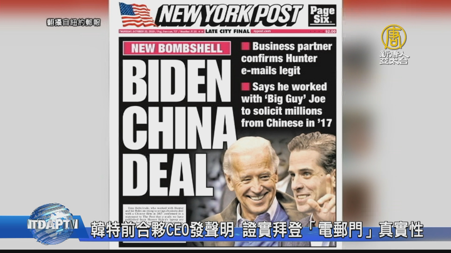 【新唐人亞太台 2020 年 10 月 22 日訊】韓特拜登「電郵門」事件繼續發酵,外媒OANN駐白宮記者里昂,21日發推文表示,本周六,前紐約市長朱利安尼將在節目中,披露拜登兒子電腦上的更多內容。另外,一名自稱是韓特公司合夥人的男子,22日向媒體發表聲明文件,他能證實《紐約郵報》曝光的電子郵件內容是真實的,拜登家族與中國華信能源公司董事長葉簡明之間,有龐大的金錢往來,甚至連民主黨總統候選人拜登,也有分一杯羹。