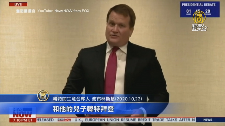 【新唐人亞太台 2020 年 10 月 23 日訊】好,今天辯論會場外,另一個焦點,就是韓特拜登前合夥人,波布林斯基,他投出爆料,拜登在副總統任期參與了在中國的交易,波布林斯基今天現場還透露,有相關人士警告他,如果把訊息爆料出去,可能會把他們都埋了。
