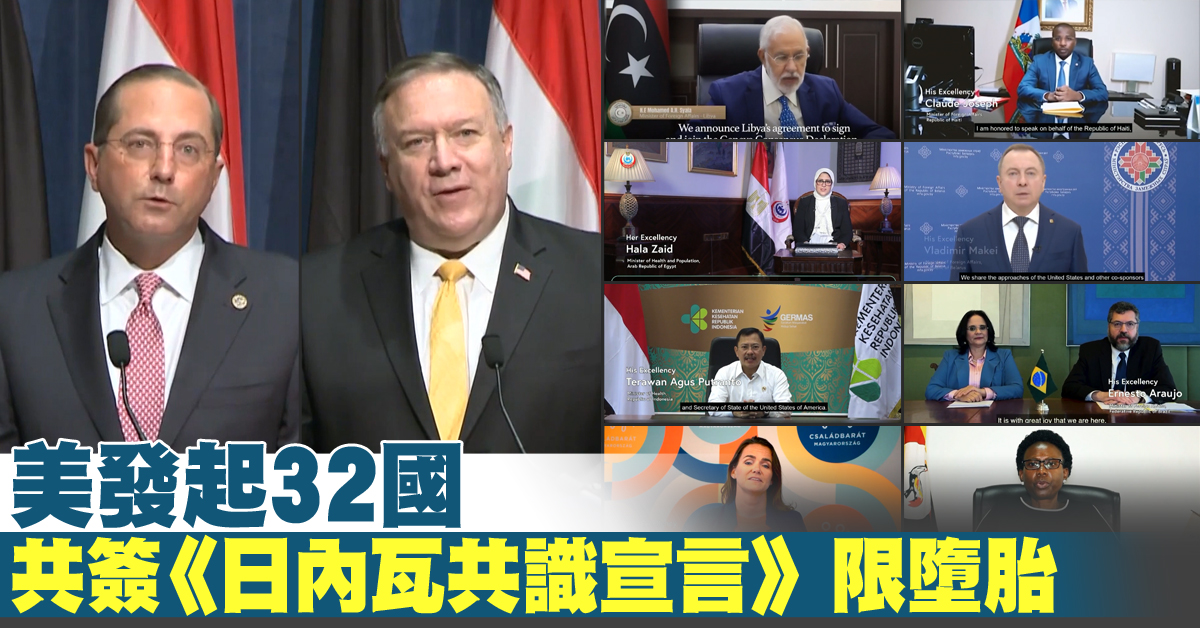 【新唐人亞太台 2020 年 10 月 23 日訊】再來看到,週四(10月22日),32個國家共同簽署一項旨在保護生命、限制墮胎的《日內瓦共識宣言》。美國國務卿蓬佩奧,和衛生部長阿薩爾,共同出席了線上的簽署儀式。