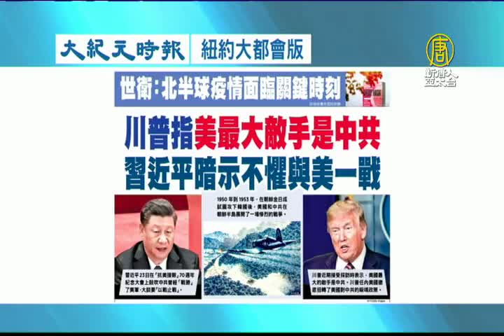 【新唐人亞太台 2020 年 10 月 26 日訊】接著看到大紀元時報紐約大都會版報導:川普指美國最大敵手是中共,習近平暗示,不懼與美一戰。