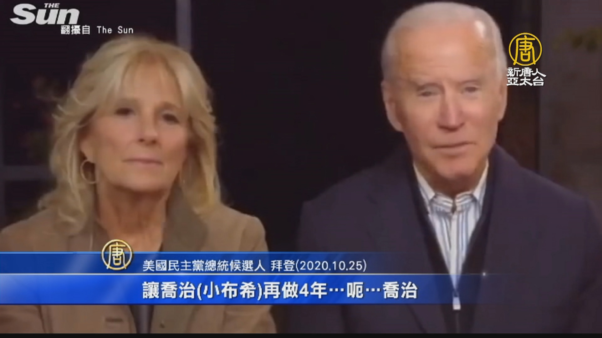 【新唐人亞太台 2020 年 10 月 27 日訊】民主黨總統候選人拜登,25日晚間在一場視訊造勢音樂會中致詞,但他疑似將川普與另一位共和黨藉的前總統小布希搞混,讓一旁的妻子頻頻幫忙提點。另外,民主黨副總統候選人賀錦麗,也在造勢場合上,把美國疫情病逝的人數,口誤多了一千倍。