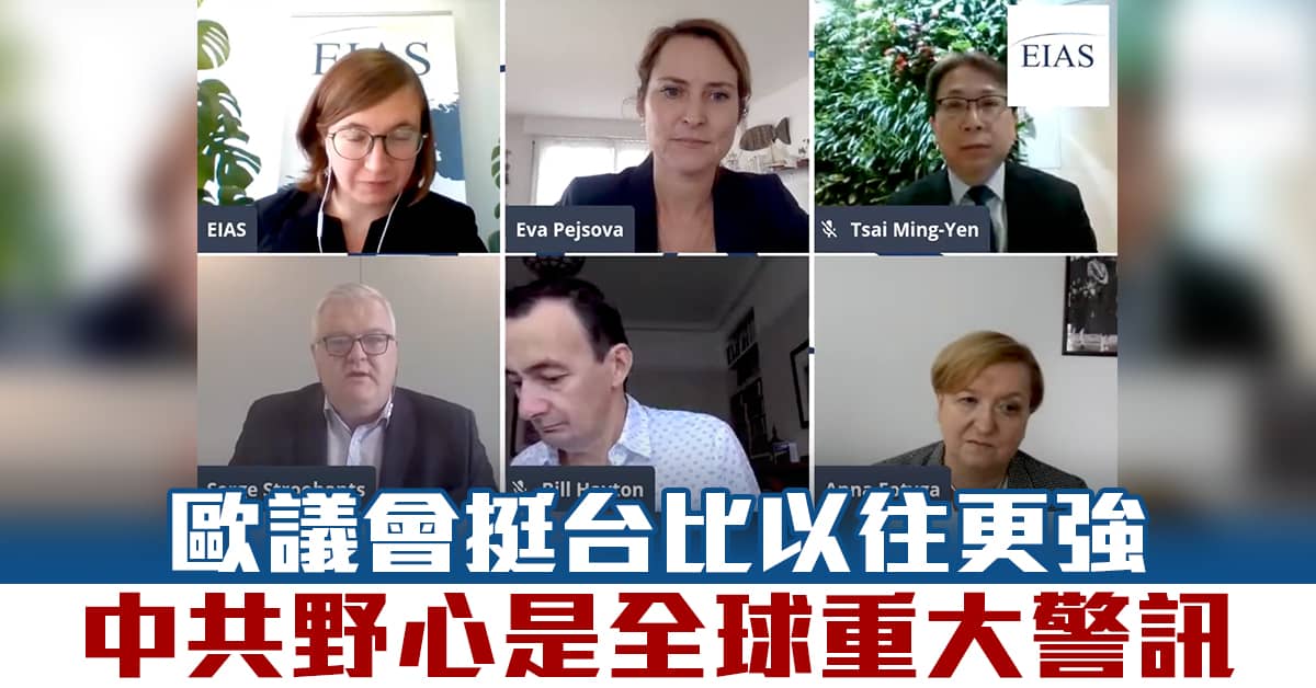 歐盟亞洲事務研究中心(EIAS)28日在布魯塞爾舉行「香港實施國安法後對於臺海及南海安全情勢影響」視訊研討會,會上歐洲議會議員們示警,在中共威脅漸增下,歐洲議會對臺灣支持力量比以往更強,但今年「港版國安法」施行後,中共野心昭然若揭,對臺灣以致全球已構成重大警訊。