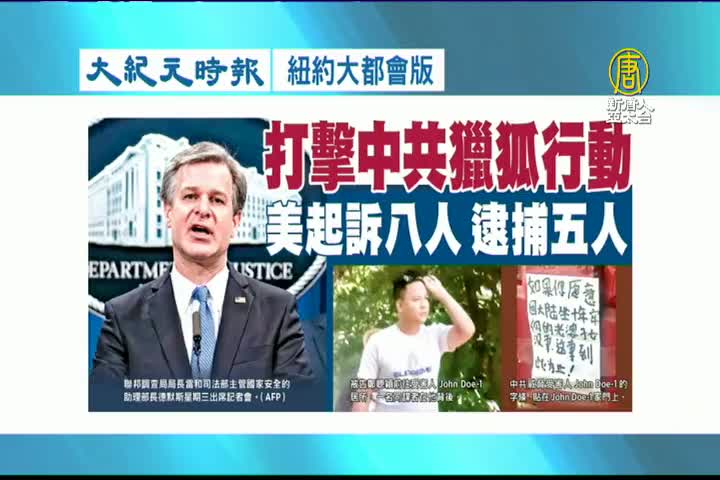 【新唐人亞太台 2020 年 10 月 30 日訊】接著看到大紀元時報紐約大都會版報導:打擊中共獵狐行動,美國政府起訴8人,逮捕5人。