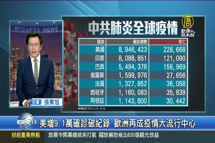【新唐人亞太台 2020 年 10 月 30 日訊】來關心中共肺炎疫情最新情況,全球累計確診超過4千5百04萬人,1百18萬1千多人死亡。但中共、伊朗等國家,被認為嚴重低報數據。全球新增確診病例連續第3天創單日新高。美國新增9萬1千多起確診,創下單日新高紀錄,累積達8百94萬6千多例。印度新增4萬8千多人染疫,共有超過8百08萬8千例確診。西班牙新增2萬3千多例,創下爆發疫情以來的新高,西班牙國會表決通過延長全國緊急狀態6個月。俄羅斯確診也新增1萬8千多例,再創單日新高。WHO歐洲區辦事處主任克魯格表示,歐洲住院率上升到比第一波疫情時還高、死亡人數急遽上升30%,歐洲再次成為疫情大流行的中心。