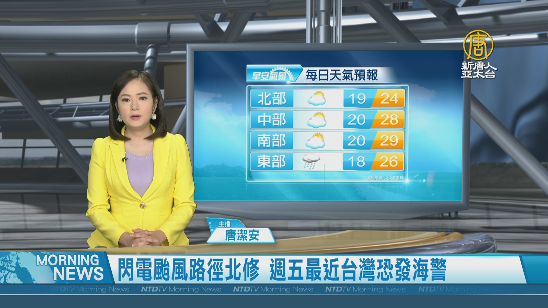 【新唐人亞太台 2020 年 11 月 04 日訊】歡迎您收看11月4日的早安新唐人,我是唐潔安,先來帶您關心今天的天氣情況。影響台灣的東北風,預估到週五才會減弱,今天清晨全台最低溫18到20度。下週日預計將有另波東北風再度增強。另外,閃電颱風路徑持續往北修正,目前各國預估未來路徑落在巴士海峽到台灣東部海域的範圍內,預估週五是颱風最靠近台灣的時候,氣象局不排除發布海上颱風警報。帶您一起來看到國際媒體重要訊息。