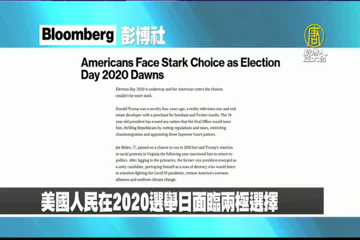 【新唐人亞太台 2020 年 11 月 04 日訊】首先來看到美國彭博社報導:美國人民在2020選舉日面臨兩極選擇。