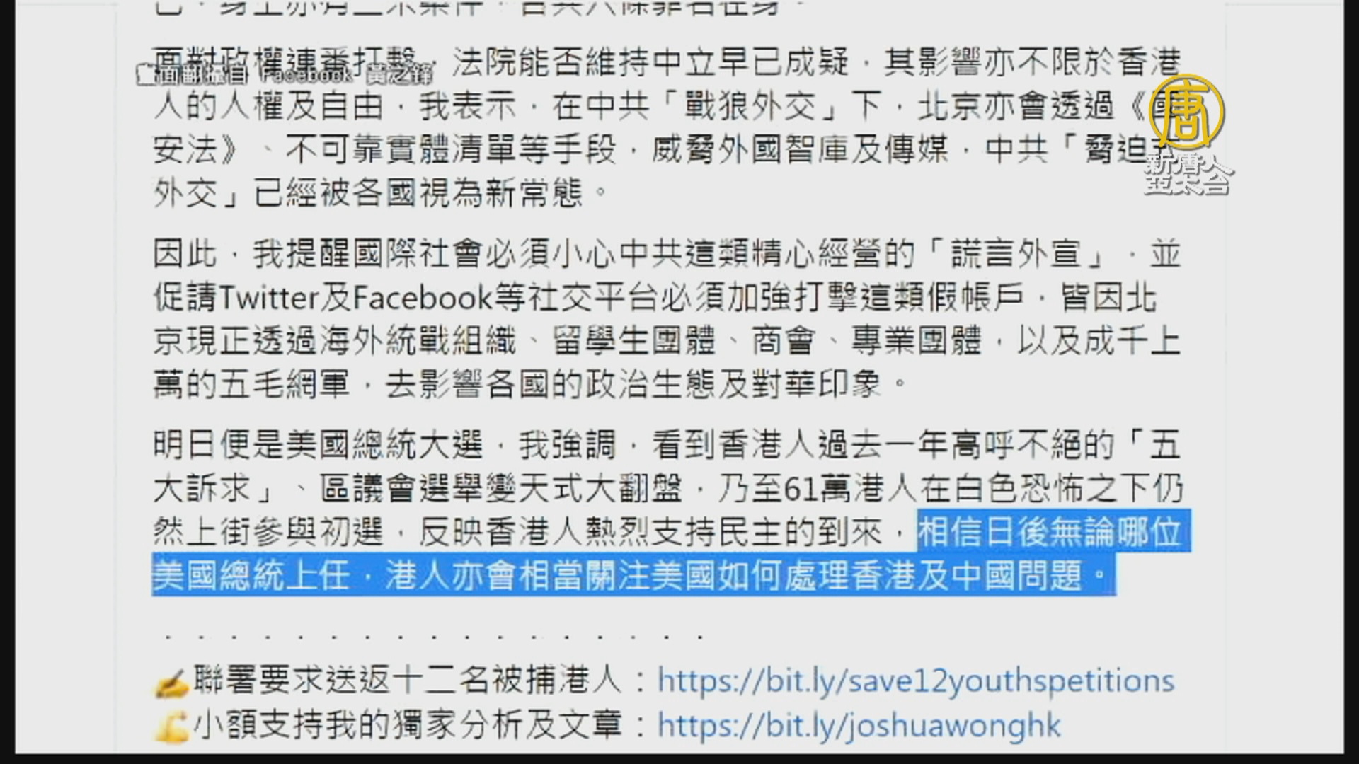 美大選開票之際 黃之鋒:日後續關注美處理港中問題