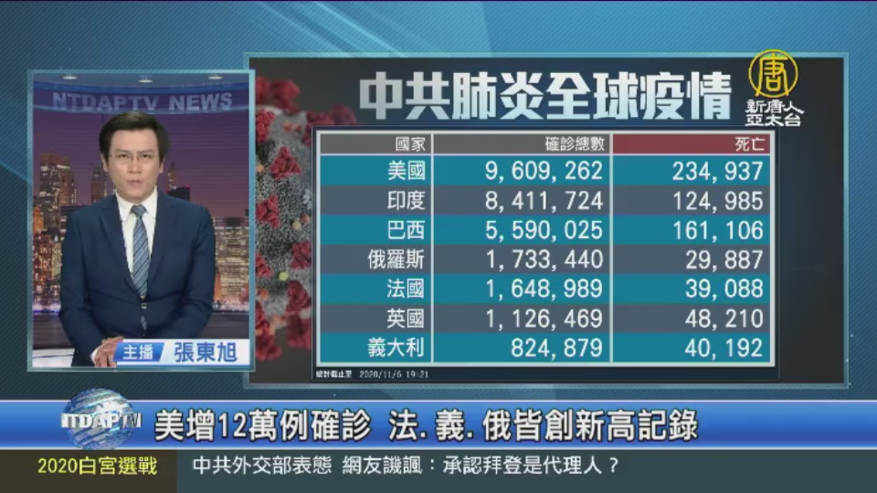 【新唐人亞太台 2020 年 11 月 06 日訊】來關心中共肺炎疫情最新情況,全球累計確診超過4千8百71萬人,1百23萬3千多人死亡。但中共、伊朗等國家,被認為嚴重低報數據。美國新增約12萬起確診病例,連續兩天突破單日紀錄。法國新增5萬8千多例,4天內兩度刷新紀錄。義大利新增3萬4千多例,連兩天破紀錄。俄羅斯也新增2萬多例確診,再刷新單日新高記錄,其中有6千2百多例在首都莫斯科。希臘宣布6日起全國進入「封鎖」防疫狀態。
