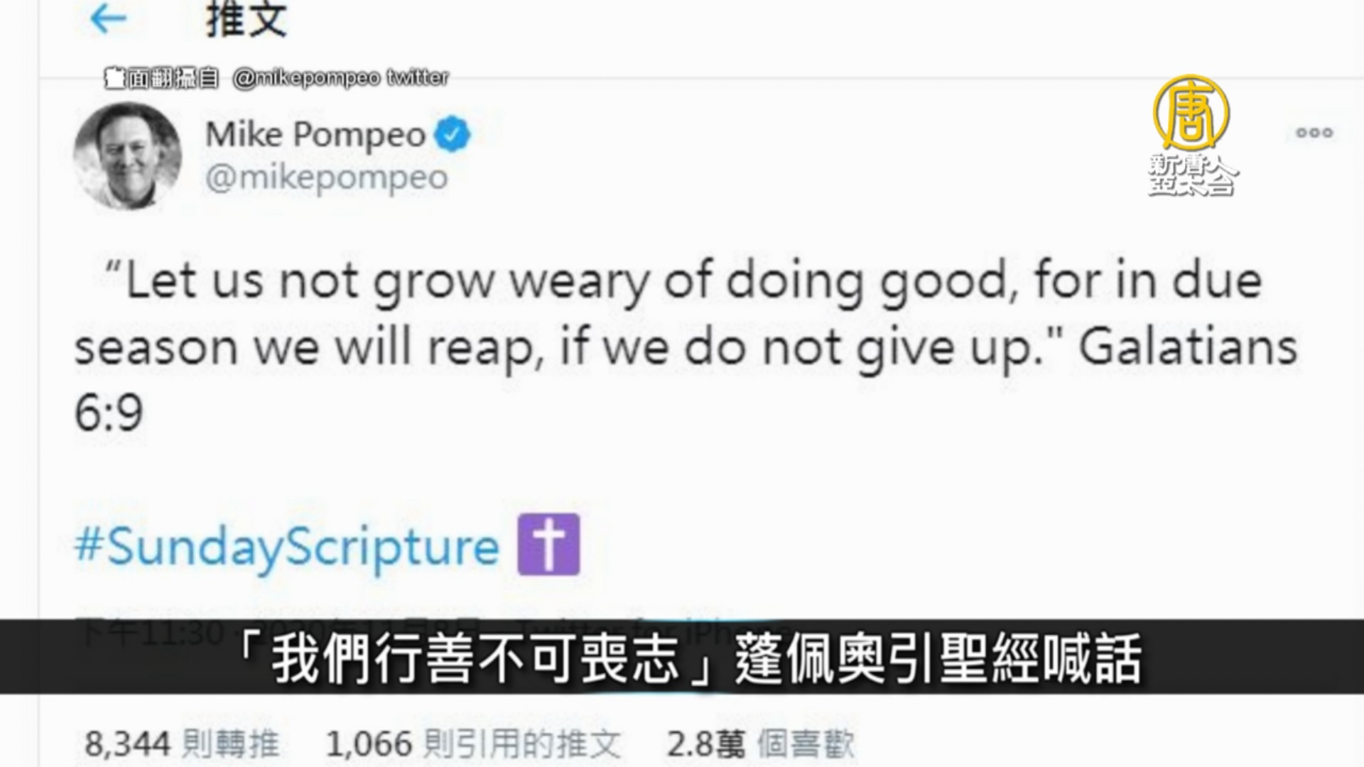 【新唐人亞太台 2020 年 11 月 09 日訊】「我們行善不可喪志」蓬佩奧引聖經喊話