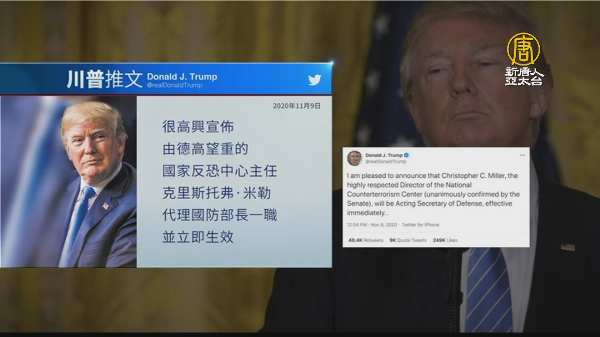 【新唐人亞太台 2020 年 11 月 10 日訊】週一(11月9日),美國總統川普宣佈,解除國防部長艾斯培的職務,同時指定國家反恐中心主任米勒代理國防部長一職。