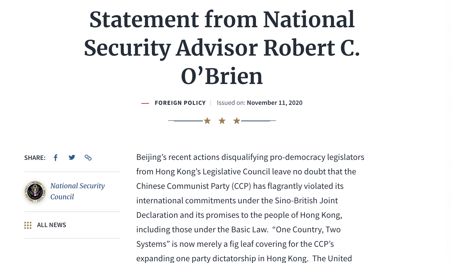 美國白宮國家安全顧問歐布萊恩(Robert C. O’Brien)11日,在國安會官網發表聲明指出,北京最近取消香港立法會民主派議員資格的舉動,這無疑顯示中國共產黨公然違反其基於《中英聯合聲明》做出的國際承諾,違反基於包括香港基本法對港人的承諾。