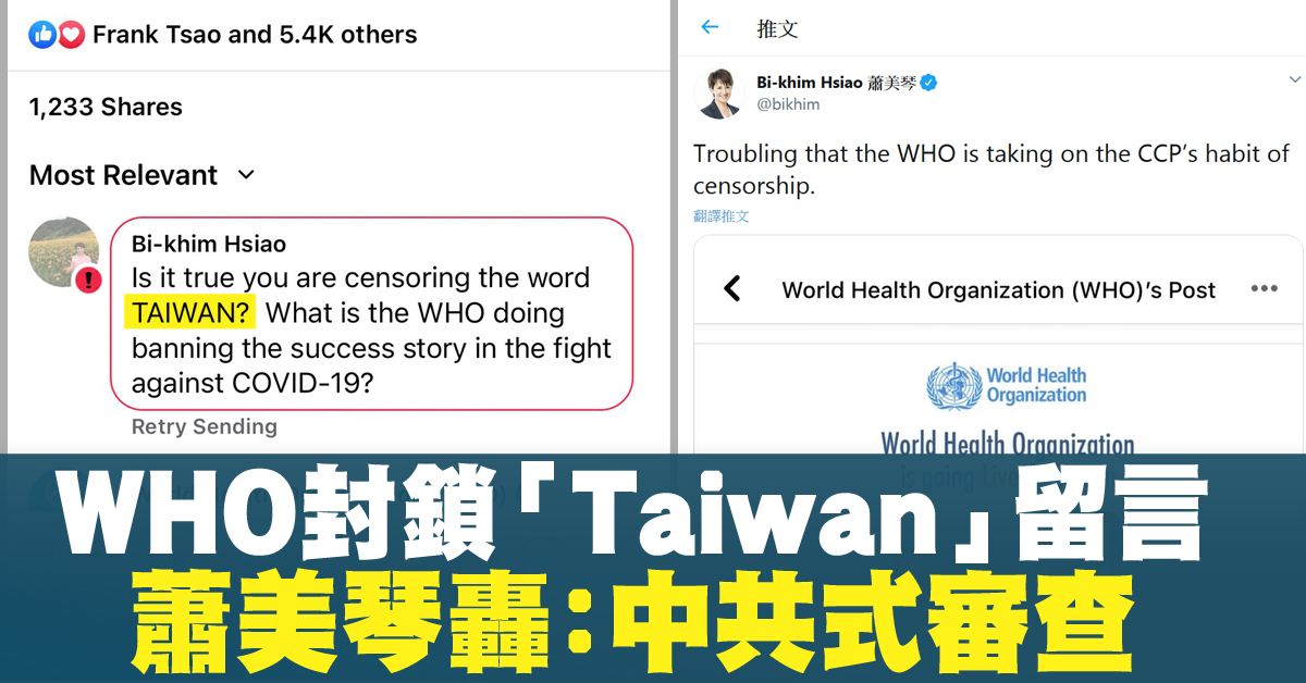 透過臉書收看WHA線上會議直播,想在底下留言Taiwan can help,沒想到卻因為出現台灣字眼,無法發表,就連人在國外的台灣駐美代表蕭美琴,也遭封鎖,發文痛批「世界衛生組織採取中共式的審查制度,實在令人擔憂」!