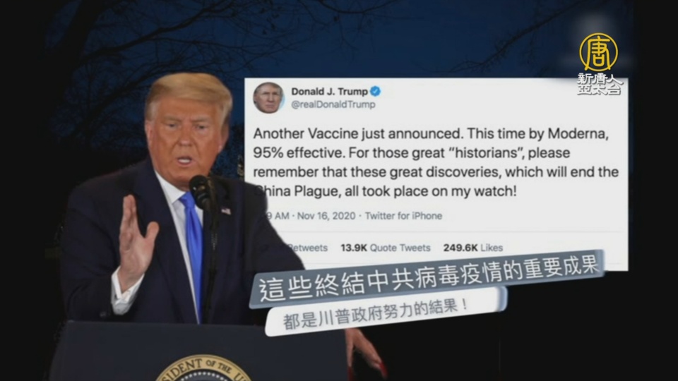 川普總統當天發文宣告莫德納疫苗的好消息,而對於民主黨一直袖手旁觀,卻要竊取他人成果的行為,川普強調,這些終結中共病毒疫情的重要成果,都是川普政府努力的結果。