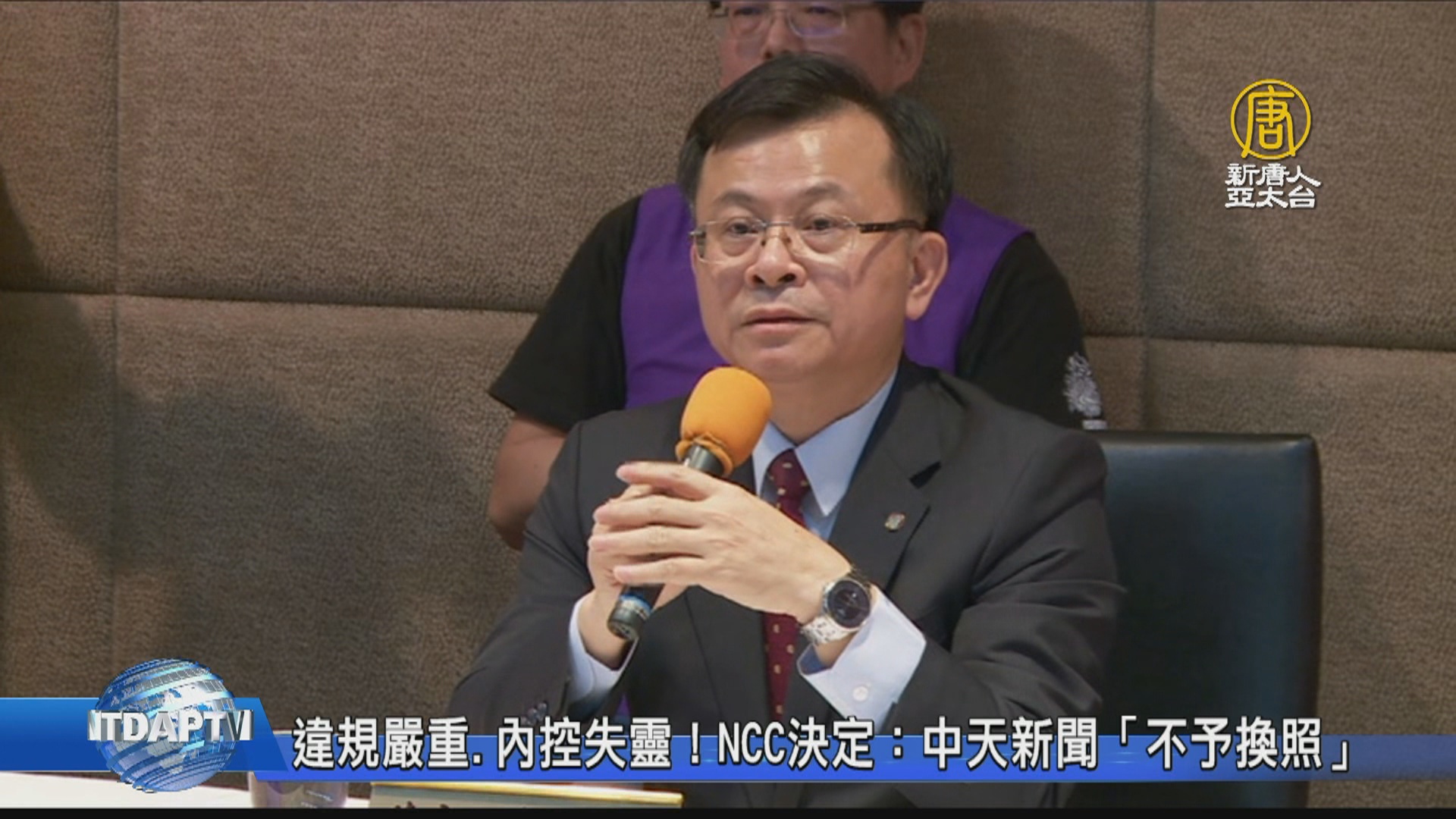 【新唐人亞太台 2020 年 11 月 18 日訊】火線消息,頭條焦點帶您關心,國家通訊傳播委員會NCC,今天(18日)審查中天新聞台換照案,會中七位委員以7比0通過否決案,NCC主委陳耀祥,下午出面說明不予換照原因,除了該新聞台違法記錄嚴重,內控機制失靈外,尤其大股東蔡衍明,明顯介入新聞製播,決議駁回換照申請。