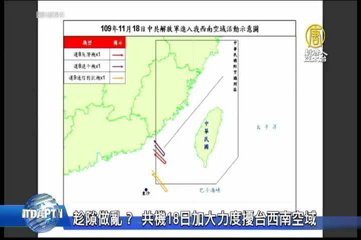 【新唐人亞太台 2020 年 11 月 18 日訊】在國軍忙著搜救花蓮失聯F-16戰機的同時,共機18日再次入侵台灣西南空域搗亂,而且共軍今天一共派出了運-8反潛機、運-8遠干機,以及運-9通信對抗機等3個架次,台灣國軍也都立即派遣空中巡邏兵力應對、廣播驅離,並採取防空飛彈追監,堅實捍衛台灣的領空安全。