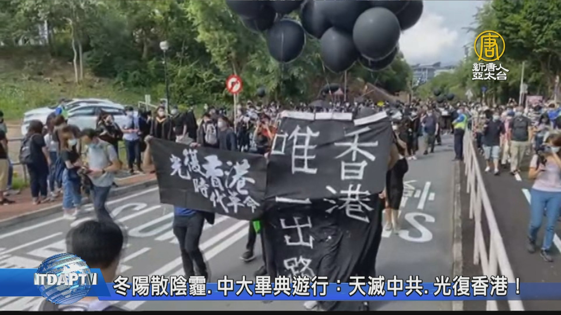 被中共強加國安法的香港,天滅中共、光復香港口號,仍然迴盪在中大校園。校方舉辦網路畢業典禮,大批畢業生自發遊行,拿著黑色氣球,悼念離世犧牲的抗爭者,聲援被壓迫、被送中的抗爭者。