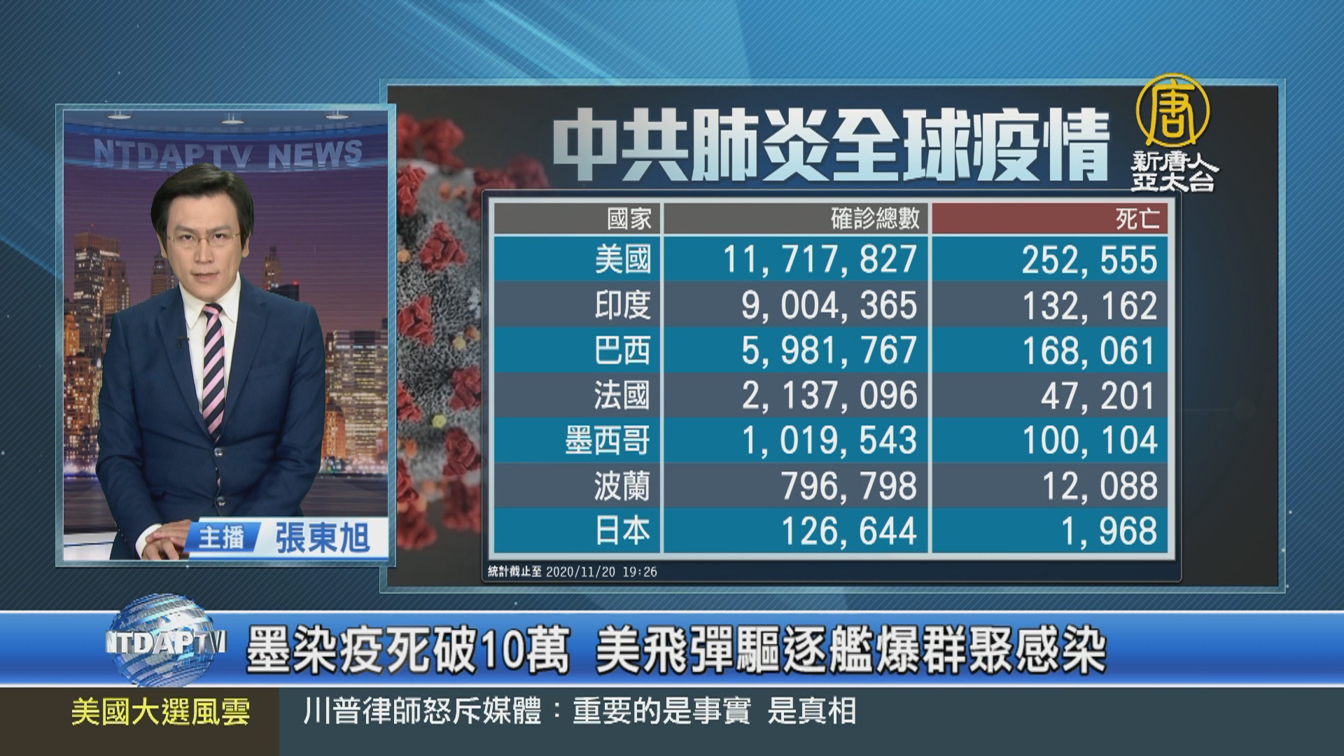【新唐人亞太台 2020 年 11 月 20 日訊】來關心中共肺炎疫情最新情況,全球累計確診超過5千6百90萬人,1百36萬多人死亡。但中共、伊朗等國家,被認為嚴重低報數據。美國連續超過兩星期單日新增確診超過10萬例。美軍 麥可莫菲號飛彈驅逐艦發生大規模群聚感染,船上3百名船員中,有將近四分之一染疫。加州州長紐森宣布,實施宵禁令一個月,將影響全州約94%的人口。墨西哥新增576起死亡病例,成為全球第4個死亡人數破10萬的國家。波蘭新增死亡637例,連續兩天創新高。WHO將波蘭列為歐洲疫情死亡率最高的國家之一。日本東京連續第2天確診超過5百人,全日本新增2千4百多例,再創新高紀錄。