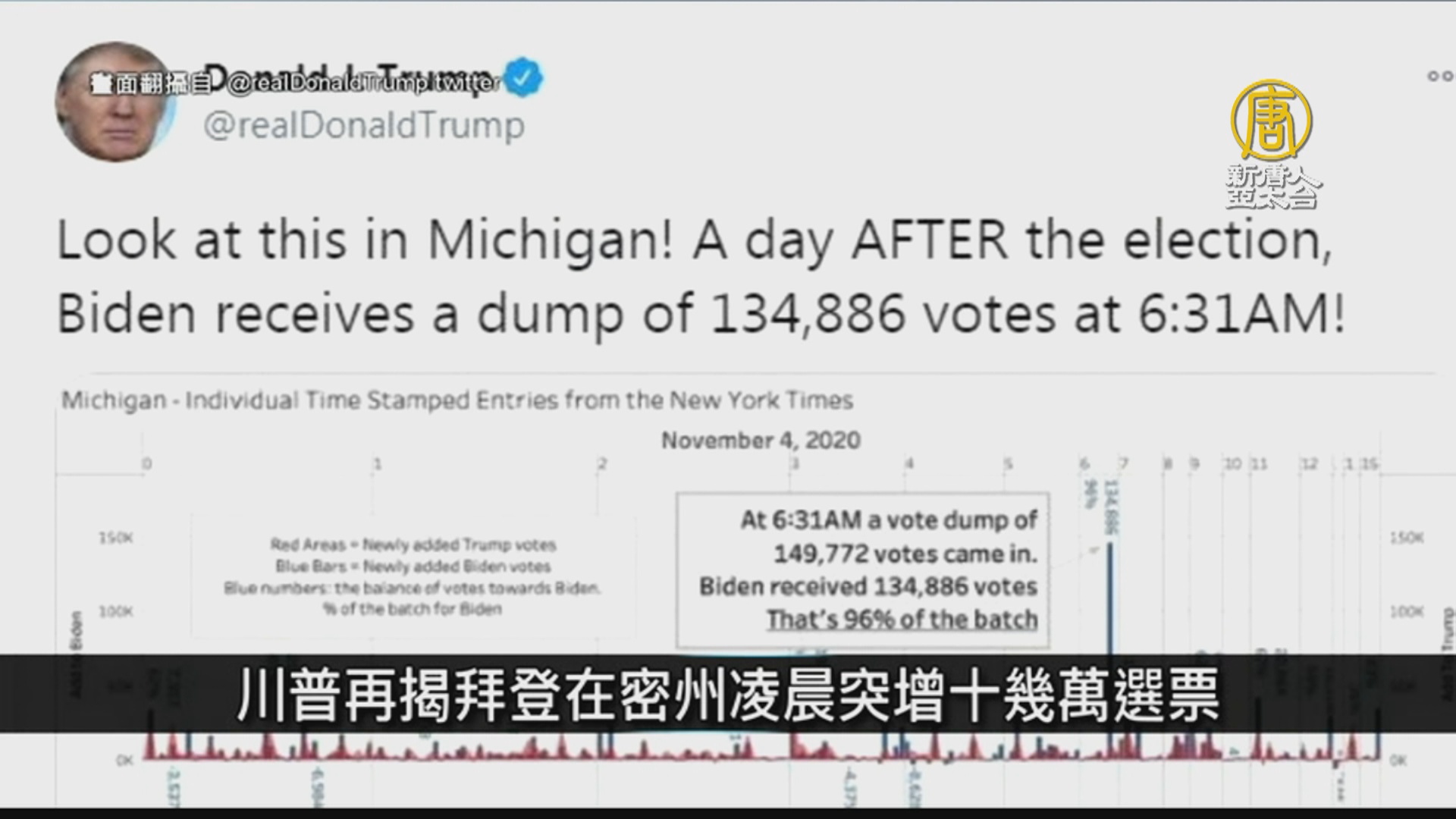 【新唐人亞太台 2020 年 11 月 20 日訊】川普再揭拜登在密州凌晨突增十幾萬選票