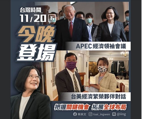 蔡英文總統晚間在臉書發文表示,台灣要走向國際,今晚就是關鍵時刻,台灣時間今天晚上,稍後有兩場重要的經濟對談將要登場,一場是APEC經濟領袖會議,一場是台美經濟繁榮夥伴對話。