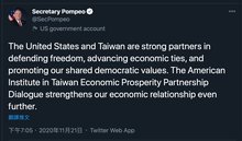 【新唐人亞太台 2020 年 11 月 21 日訊】美國國務卿蓬佩奧(Mike Pompeo)台北時間21日晚間推文寫道,「美國和臺台在捍衛自由、促進經濟關係和促進共享民主價值觀方面是強大的夥伴, 美國在台協會AIT 經濟繁榮夥伴關係對話,進一步加強我們彼此的經濟關係。」