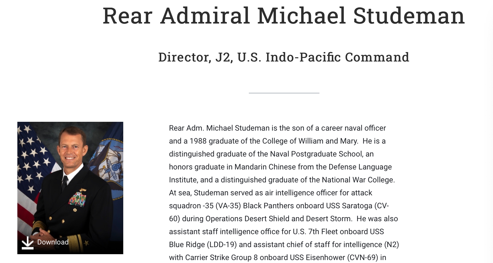 美國海軍網站,史達曼少將,任職印太司令部J2部門的指揮官(Director),該部門任務是印太地區的情報蒐集與分析。史達曼曾任夏威夷聯合情報行動中心太平洋司令部研究組的第一任負責人、美國海軍情報局中國第一任高級情報官;以及美國艦隊司令部指揮官倡議組織的第一任主任。