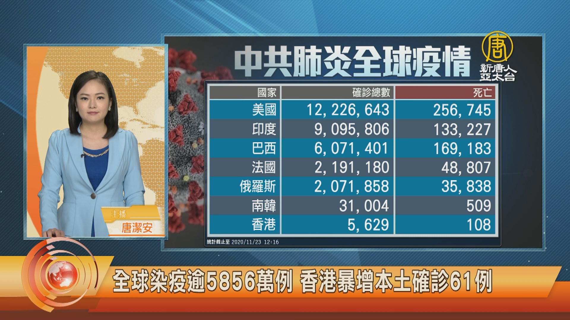 【新唐人亞太台 2020 年 11 月 23 日訊】來關心中共肺炎動態,目前全球公開數據,累計確診超過5千8百56萬人,死亡超過 138萬人。美國連續 20天單日新增超過 10萬例確診,累計確診超過 1千2百22萬例,死亡 25萬6千多人。法國新增 1萬3千多例確診,疫情稍有趨緩,政府預計未來幾週逐漸鬆綁防疫封鎖措施。另外,南韓23日新增 271例確診,其中255例為本土感染,是時隔6天後,首次單日新增低於 300例,另外南韓新增4人死亡。香港週日(22日)暴增68例確診,其中 61例是本土感染,且大多來自於一個「跳舞群組」。另外,中共、伊朗等國家,被認為嚴重低報數據。