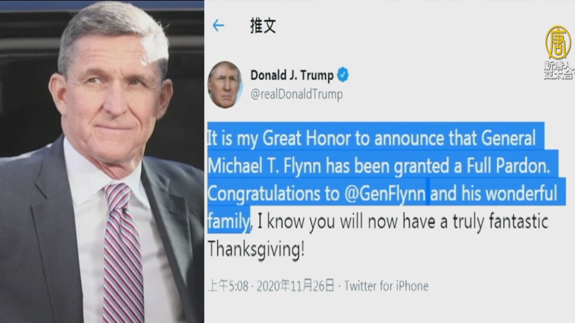 【新唐人亞太台 2020 年 11 月 26 日訊】美國總統川普週三通過推特宣布,他赦免前國家安全顧問邁克爾·弗林。川普寫到「我非常榮幸地宣布,邁克爾·弗林將軍已獲得完全赦免。祝賀弗林將軍和他美好的家庭」,弗林是川普的第一任國安顧問,川普上任以來,民主黨發動三年多通俄門調查,弗林案一波三折。在川普赦免弗林後,弗林可以徹底地從法院和司法部的官司中解脫出來。這場始於聯邦調查局對2016年大選期間川普競選團隊與俄羅斯政府之間,所謂「勾結」的調查,已被證明是虛假不實的。弗林的律師鮑爾和保守派媒體成員,指責聯邦調查局誘捕弗林。